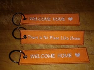 These Key rings are an embroidered on material approx 25mm by 100mm in size.